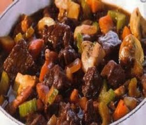 - Préchauffer le four à 180°C (350°F) Fariner les cubes de viande. Dans une grande casserole, dorer la viande de toutes parts dans l'huile. Ajouter les légumes et cuire de 3 à 4 minutes. Ajouter le vin, le bouillon, la pâte de tomates, l'ail, les feuilles de laurier et le thym. Saler et poivrer. Porter à ébullition, couvrir et cuire au four environ 2 heures.