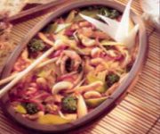- Délayer la fécule de maïs dans le bouillon concentré de poulet et la marinade réservée, verser dans la poêle ou le wok. Laisser mijoter 1 minute pour épaissir, déposer dans un plat de service et parsemer de noix d'acajou. Servir.