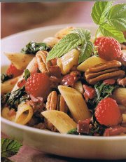 - Ajouter les pennes cuits, les raisins égouttés, les pacanes, l'huile de sésame et la moitié des framboises. Mélanger délicatement. Assaisonner de sel et de poivre au goût. Servir immédiatement des portions individuelles dans de grands bols. Garnir de fromage parmesan, de pacanes entières et du reste des framboises.